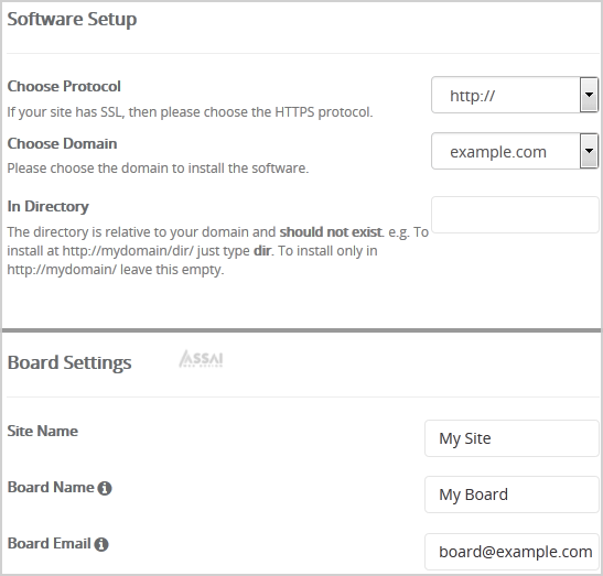 - In Directory: If you want to install this in a directory, for example example.com/forums, enter the directory name. Otherwise, leave this blank to install in your main domain example.com