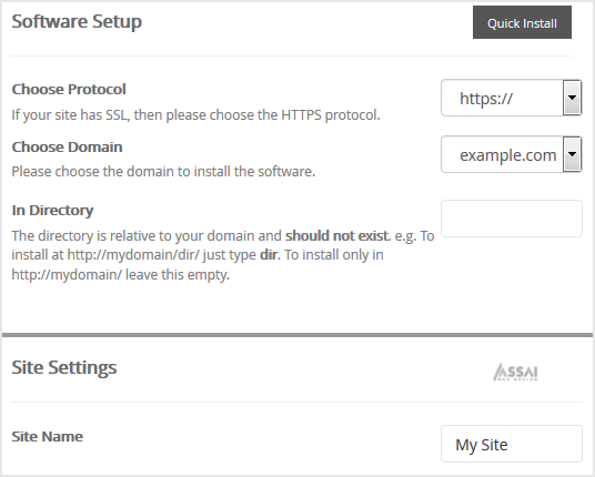 - In Directory: If you want to install this in a directory, for example example.com/directory, enter the directory name. Otherwise, leave this blank to install in your main domain example.com